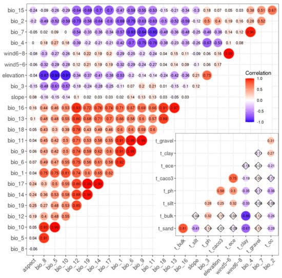 All environmental variables were preprocessed to a unified coordinate system, cell size and spatial extent. Correlations among environmental variables can reduce the accuracy of a model [26], so that the multi-collinearity of variables needs to be avoided. We used Pearson’s correlation coefficient (r) to screen environmental variables for multicollinearity. For variables with |r| ≥ 0.85, the variables with least biological meaning in the group of highly correlated variables were selected for removal, and finally the independent and biologically meaning environmental variables were selected. Finally, out of 33 variables, only 11 environmental variables were retained to simulate the current and future distributions of A. arguta in China (Table 1, Figure 3).
