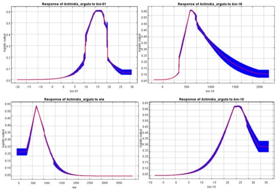 The fitness index of A. arguta increased and then decreased with the increase in annual mean temperature (bio_1); when the annual mean temperature (bio_1) was 12–18 °C, the fitness index was close to 0.5. The precipitation of the warmest quarter (bio_18) fitness index increased continuously from 320 to 630 mm, with the fitness index approaching 0.9 at 630 mm and then decreasing. The fitness index reached 0.5 between 580 and 840 m, and tended to 0 after the elevation (ELE) was greater than 2000 m. The mean temperature of the warmest quarter (bio_10) at 22–29 °C had a fitness index greater than 0.5.