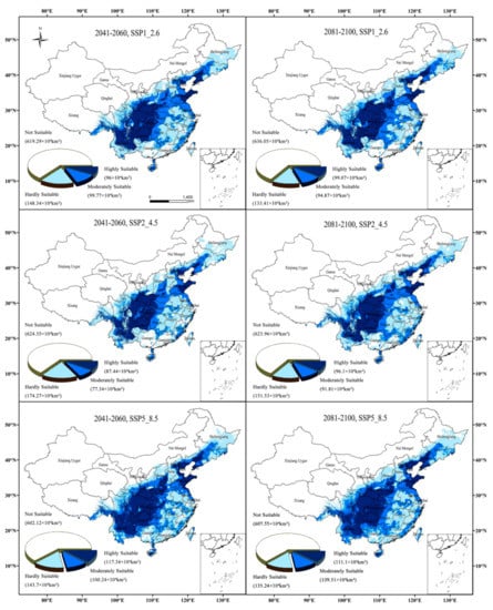 From west to east, the highly suitable habitat concentrated in Sichuan Basin, Guizhou Plateau, most of Qinba Plateau, Southwest Shaanxi and Western Yunnan. Among them, the highly suitable habitat mainly concentrated in Shaanxi, Yunnan, Sichuan and Guizhou, with a total area of about 0.839 × 106 km2, accounting for about 8.73% of China’s land area. The moderately suitable habitats were distributed in Liaoning, Shandong, Yunnan, Shanxi and Hubei provinces. Low suitable regional distribution was fragmented in Central and Southwestern China.