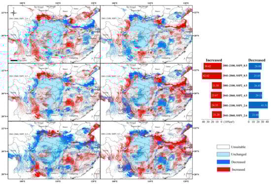 Geographically, the eastern high latitudes are more suitable for A. arguta, which is closer to the center of the native range of the species. Shaanxi and the Yunnan-Guizhou plateau continued to be areas of highly suitable habitat in the future scenario period. However, the area of highly suitable habitat in Liaoning, Shandong and Eastern Hebei increased in the future scenario period. Similarly, the moderately suitable habitat of A. arguta showed an expansion trend to the east. The area of moderately suitable habitat increased in Central Jilin, Central Liaoning, Shandong, Henan, Eastern Jiangsu, Western Hunan, Fujian and Hainan. The area of hardly suitable habitat in Southern Heilongjiang, Jilin, Jiangxi, Central Hebei, Northern Shaanxi and Hainan increased. Especially under the 2041–2060, SSP5_8.5, the most significant increase, the lost area for A. arguta was predicted to be 25.85 × 104 km2; the gained area was predicted to be 42.62 × 104 km2; then during the 2081–2100, the loss and increase in area were 28.08 × 104 km2 and 39.42 × 104 km2, respectively. In contrast, under the SSP2_4.5, the smallest change in the increase and decrease in the area of A. arguta was observed. In 2041–2060, the increase and decrease in the habitat were 23.67 × 104 km2 and 29.13 × 104 km2, respectively. In 2081–2100, the trend of increase and decrease in the area was similar (Figure 7).