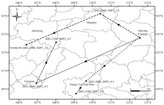 The SDM toolbox 2.0 package was used to quantify the effect of climate change on the geographic distribution of A. arguta [35]. This tool reduces the distribution of A. arguta to a single central point and generates a vector file that indicates the direction and magnitude of the change over time [35,36,37]. In the end, we examined the shifts in distribution by tracking how the centroid changed with different periods.