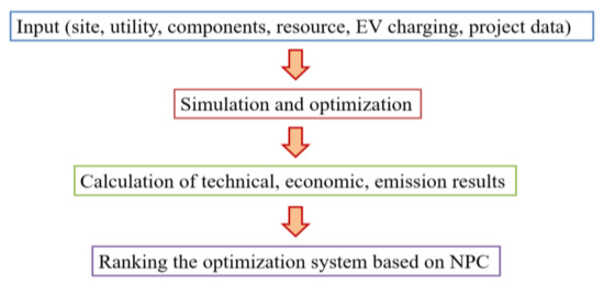 In this paper, the PV-powered EV charging station is designed and optimized by using HOMER Grid software of HOMER Energy LLC microgrid simulation program company [35]. HOMER Grid supports the grid-connected renewable power system with suitable algorithms for optimizing solar, wind, storage, and minimize the overall energy costs. Moreover, HOMER Grid can also model the electric vehicle (EV) charging station combined with clean power sources such as PV, wind energy, and the utility grid. Thus, this program can help users design optimal renewable energy and storage systems to decrease utility costs and demand charges of EV charging.
