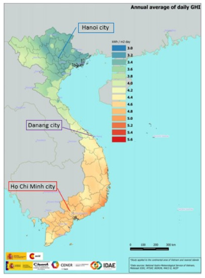 In this study, three big cities of Hanoi, Da Nang, and Ho Chi Minh in Vietnam with different solar irradiation conditions are selected as shown in Figure 2.