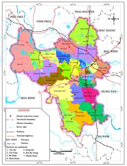 - Introduction and Overview about the Geography of Hanoi City. Available online: https://hanoi.gov.vn/diachihanoi/-/hn/RtLibd2X8kEn/1001/124742/gioi-thieu-tong-quan-va-khai-quat-ve-dia-li-thanh-pho-ha-noi.html. (accessed on 18 January 2021).