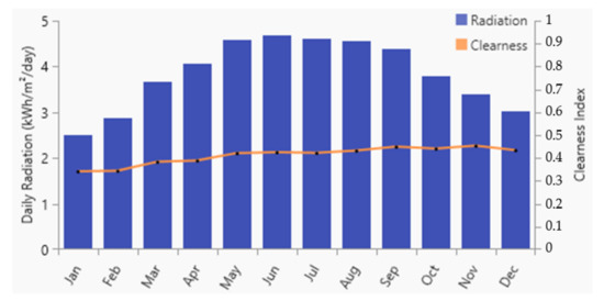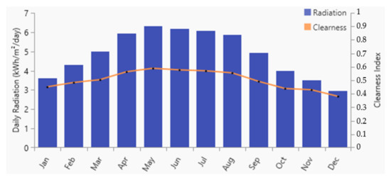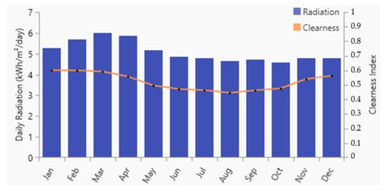 Hanoi city (see Figure 3) is the capital and the commercial, cultural, and educational center of Vietnam, with an area of about 3359 km2 [39]. The population in Hanoi increased rapidly and obtained above 8 million people in 2019. The climate of Hanoi is a tropical monsoon climate while the weather has hot and cold seasons. The weather includes the rainy season (from April to October) and the dry season (from November to March). The average winter temperature from November to March does not exceed 22 °C, while the average temperature in the summer from May to September exceeds 27 °C [40]. From the Homer data, the monthly average solar global horizontal irradiance in Hanoi is 3.84 kWh/m2 day, as can be seen in Figure 4. The highest irradiation month is June (4.67 kWh/m2 day) and the lowest irradiation month is January (2.49 kWh/m2 day). Besides, the technical solar power potential on the rooftop of Hanoi city is 13,169.72 MWp and 37,591,481.20 MWh per year, respectively [41]. The city’s electricity load growth rate in Hanoi is consistently high at 9%, the power loss rate is smaller than 3.9%, and commercial electricity is about 21,500 million kWh [42]. Therefore, the development of rooftop solar power in Hanoi is possible.