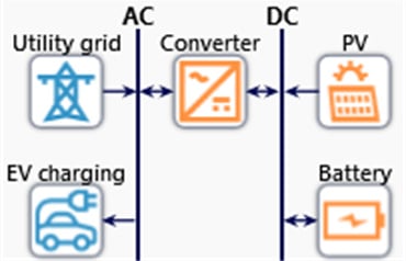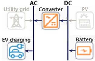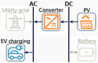+ Mode 1 (Only charging from solar power system): If the weather is good, the EV charging station is charged entirely by the PV system (see Figure 10). In this mode, the charging station will be disconnected from the utility grid.