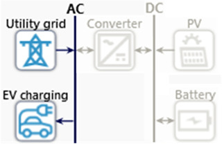 + Mode 2 (Only charging from the utility grid): if the solar array cannot generate enough power to the EV charging station due to no sunlight (at night) or extremely low radiation (rainy day, cloudy day), the EV charging station is operated by the utility grid (see Figure 11).