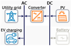 The structure of a typical grid-connected PV-powered EV charging station consisting of the main components of the PV system, the DC–AC and AC–DC bi-direction converter, the utility power grid, backup batteries, and electric vehicles, as can be seen in Figure 9. This structure is the best selection of the EV power supply model to improve the cost of electrical energy supply, reduce the price of the solar power systems, batteries, and carbon emissions [36].