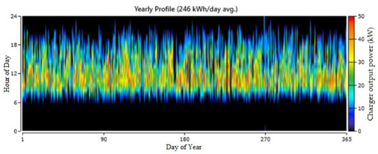 Figure 15 shows the yearly EV charging station operating frequency with an average daily charging of 246 kWh/day. The daily main charging times for EVs are from 8 a.m. to 5 p.m.; other times of the day from 6 a.m. to 7 a.m. and from 6 p.m. to 12 midnight have a lower charging frequency.