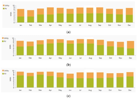Monthly generated electricity per year from the solar power system and utility grid. (a) Hanoi; (b) Da Nang; (c) Ho Chi Minh.