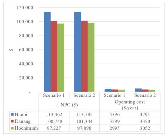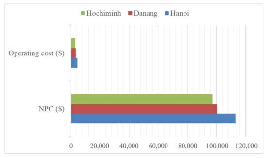 Figure 17 shows the NPC and the operating cost of the PV-powered EV charging station in three cities. Ho Chi Minh has the lowest NPC and operating cost. These costs in Da Nang are slightly greater than Ho Chi Minh while Hanoi has the highest NPC and operating cost.