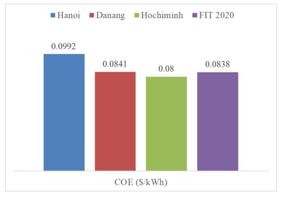 COE of the PV-powered EV charging stations in three cities of Hanoi, Da Nang, and Ho Chi Minh are shown in Figure 18. Hanoi has the highest COE of 0.0992 $/kWh, Da Nang’s COE is 0.0841 $/kWh while Ho Chi Minh has the lowest COE of 0.08 $/kWh. The COE of Ho Chi Minh is lower than the rooftop solar power FIT price in 2020 of 0.0838 $/kWh encouraged by the Vietnamese government. Therefore, the investment of the PV-powered EV charging station in Ho Chi Minh and other areas in Vietnam with similar or higher solar radiation conditions is completely feasible and can develop in the coming time. The PV-powered EV charging stations at Da Nang and other areas having the same solar radiation with COE equivalent to the solar power FIT price in 2020 can also be considered investing by optimizing the selection of equipment to reduce investment costs. Hanoi has high COE, so it is difficult for investors to make profits, the construction of the PV-powered EV charging stations at the lowest solar radiation areas should be supported by funding from the government or other organizations, etc.