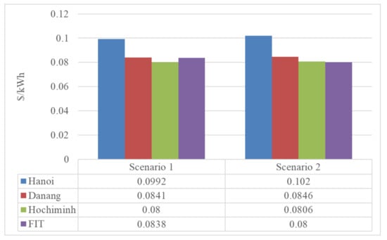Figure 20 presents COE changes of the PV-powered EV charging stations in three different solar radiation regions with FIT price scenarios. The lower the FIT price, the higher the COE. The solar EV charging station at Ho Chi Minh can be invested by reducing the investment cost because the COE is only slightly higher than the FIT price in scenario 2. The COE of the PV-powered EV charging station at Da Nang and Hanoi in scenario 2 is greater than the new FIT price, so it is necessary to have the support capital from the government or other organizations to construct PV-powered EV charging stations.