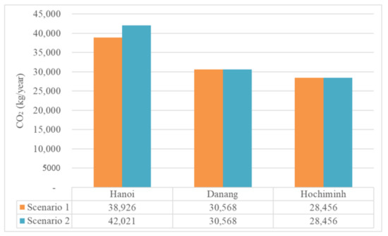 CO2 emissions from the PV-powered EV charging stations in different solar radiation regions are shown in Figure 21. The results present that the generated amount of CO2 from the EV charging station at Hanoi in scenario 2 is 3095 kg/year more than scenario 1 because the PV capacity of the optimal EV charging station configuration in scenario 2 decreases compared to scenario 1. The generated amount of CO2 from the EV charging station remains unchanged in both scenarios in Da Nang and Ho Chi Minh, with 30,568 kg/year and 28,456 kg/year, respectively.