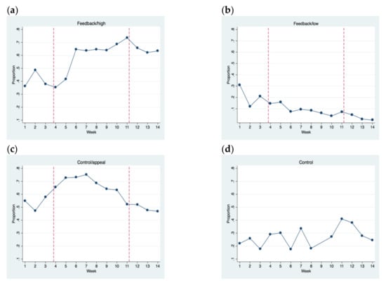 Prevalence of sustainable choices across treatments: (a) Feedback/high, (b) Feedback/low, (c) Control/appeal, (d) Control. Vertical dashed lines: begin and end of the intervention period.