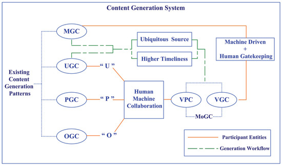 MoGC consists of Vehicle-Participatory Content (VPC) and Vehicle-Generated Content (VGC), which are simply defined in our prior work [41]. As shown in Figure 2, combined with ICV-aided MoGC, the content-generated patterns are used for different entities in various conditions. The relationship between MoGC and existing patterns can be categorized into two aspects: participant entity and generation workflow.