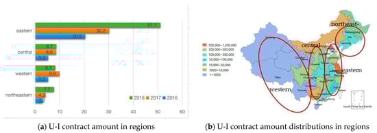 The ladder shape of U-I collaborations performances in China shows an “imbalance” problem of spillover effects (Figure 1). The number of technology transfer commissions between universities and enterprises in Beijing and Jiangsu was 3360 totally in 2017, with only one case in Inner Mongolia, two cases in Ningxia. In 2018, the highest number of contracts for transforming scientific and technological achievements by U-I in the four regions (Appendix A) was eastern regions, at 51.1 billion yuan, the least is northeastern. The western part got 8.3 billion yuan, a decrease of 20.1% compared with 2017. Using external universities’ resources and matching with industrial innovations to promote innovation capabilities in regions, especially in lagging regions, has become a common concern of local governments. Understanding the inter-regional U-I collaborative knowledge flow has great significance.