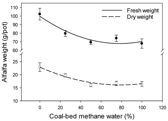 Mean of total fresh weight and dry weight of alfalfa (Medicago sativa) for six replicates irrigated with various percentages of coalbed methane co-produced water (CBMW). Standard errors of each mean are drawn as capped lines extended vertically from each mean. Irrigation treatments contained the following mixture of CBMW and fresh water: 0% CBMW (fresh water only); 25% CBMW (25% CBMW and 75% fresh water); 50% CBMW (50% CBMW and 50% fresh water); 75% CBMW (75% CBMW and 25% fresh water); and 100% CBMW. Plants received CBMW treatments for 150 days. Both fresh weight (r-square = 0.54) and dry weight (r-square = 0.55) followed quadratic regression curve with p-value of <0.0001. Y = 100.3 − 0.085x + 0.0055X2 and Y = 23 − 0.181x + 0.0012X2 represents equation for fresh weigh and dry weight, respectively; where Y is total weight and x is the % of CBMW.