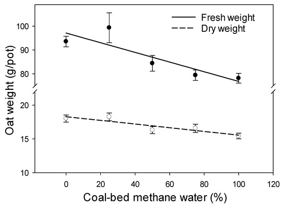 Mean of total fresh weight and dry weight of oat (Avena sativa) for six replicates irrigated with various percentages of coal-bed methane co-produced water (CBMW). Standard errors of each mean are drawn as capped lines extended vertically from each mean. Irrigation treatments contained the following mixture of CBMW and fresh water: 0% CBMW (fresh water only); 25% CBMW (25% CBMW and 75% fresh water); 50% CBMW (50% CBMW and 50% fresh water); 75% CBMW (75% CBMW and 25% fresh water); and 100% CBMW. Plants received CBMW treatments for 45 days. Both fresh weight (r-square = 0.4) and dry weight (r-square = 0.37) followed linear regression curve with p-value of <0.0001. Y = 97.1 − 0.2x and Y = 18.3 − 0.027x represents equation for fresh weigh and dry weight, respectively; where Y is total weight and x is the % of CBMW.