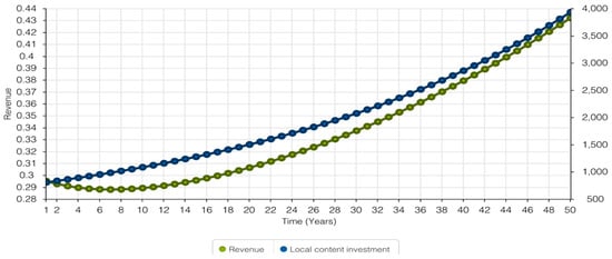 In systems dynamics, the figures associated with each variable matter. Table A2 in the Appendix A provides a 50-year overview of how knowledge transfer, local content investment, human resources, oil production, and revenue increases in Ghana. The time series charts in Figure 4, Figure 5, Figure 6, Figure 7 and Figure 8 illustrate the increments of the variables against local content investment. The Figures presents the years from a simulated year 1 (2020) to year 50 (2070). In Figure 4, local content investment is projected to increase from $779 million to $1.048 billion in 10 years and $3.0807 billion in 50 years. The increment in local content investment will yield a corresponding revenue increase through oil and gas revenue to $29 billion to $44 in 50 years. However, the revenue in the green line in Figure 4 shows a slight depression between years 2 and 7.
