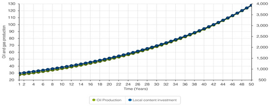 The revenue generated from oil and gas production is all connected with oil production. Hence, in Figure 5, oil production increases as the local content investment increases. There is a similarity between revenue generation and oil production in Ghana. Oil production rises from 28 (BPD 280,000) to 130 (BPD 1.3 million) in 50 years. The direct proportionality between revenue, oil production, and local content investment reveals an increase in local content policy that will drive the aforementioned variables.