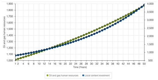 In summary, there is linearity between revenue, oil and gas local content investment, oil production, and human resources. The validation of the models mentioned above with a sensitivity analysis under different scenarios will be subsequently produced.