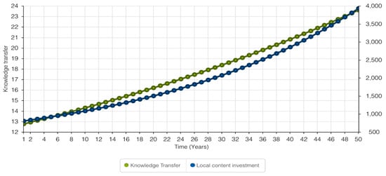 Oil and gas human resources depend on knowledge transfer from R&D centres and foreign expatriates. Although knowledge transfer has no dimension or unit of measurement, the indices start from just above 11 and increase to 24 within 50 years, as indicated in Figure 7. Knowledge transfer indices increase more rapidly when accompanied by positive local content policy and investment.