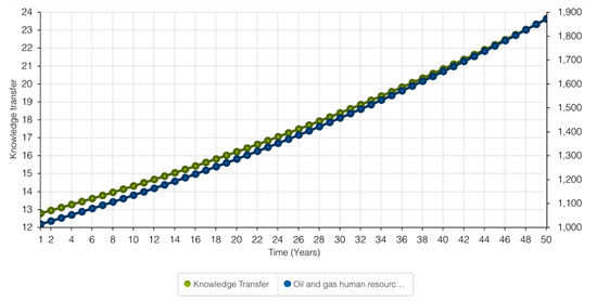 A comparison of knowledge transfer and oil and gas human resources in Figure 8 also shows a directly proportional relationship, thus creating a linear model for knowledge transfer and human resources development over 50 years.
