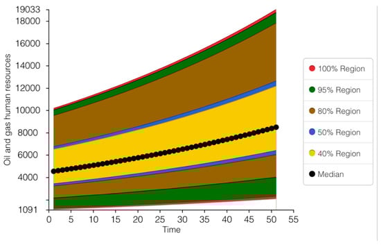 The oil and gas human resources sensitivity analysis adopted the formula 1000*Rand (0.5, 10.5). The assumed number of oil and gas staff is 1000, and the simulated human resources only rise to 1900 staff in the stock-flow diagram. Under uncertainties and in a different situation, the number of staff may rise or fall over the next 50 years. The lower uniform random distributional minimum interval of 0.5 was used again as 10X of the minimum for the maximum distribution. The results provided a median range of 5946 staff in the first year to a maximum of 12,725 staff in the 50th year. Confidence regions show lines below and above the median values, which is linear across the years. The upper and lower intervals of 40% and 80% are more dominant in this region of the graph in Figure 9.