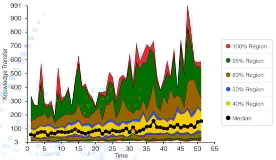 As compared with the stock-flow diagram simulation, knowledge transfer only has a maximum index of 24. In the best-case scenario with a 100% confidence region, there will be a maximum of 991 indices. Overall, there is a 95% probability that knowledge transfer will reach its peak in 47 years.