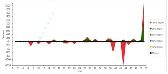 The formula 779*Rand (0.5, 2.5) was used for this sensitivity confidence analysis. The initial value of $779 million for local content investment is taken against a random uniform distribution over a period of 50 years. A median range of $1.002 billion in the 1st year rises exponentially to $5.025 billion in the 50th year, as shown in Figure 11. Across the regions, there is a 40% and 80% chance that this value will rise over the next 50 years to a maximum of $6.03 billion and $8.12 billion, respectively. On the contrary, if there is a fall in investment below the median line, this drop will still be below $1.7 billion under the 100% region in 50 years.