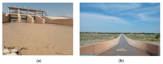 Sediment conditions at the diversion barrage. (a) High sediments concentration at downstream of the under sluice sections of the barrage as a result of flushing from GZ dam during 9–10 May 2019; (b) View of the main canal from canal head regulator on 10 May 2019.