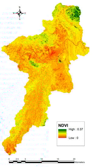 The crop management factor C reflects the effects of cropping and management practices on erosion. In RUSLE, its value is calculated as a product of five subfactors: prior land use, canopy cover, surface cover, surface roughness, and soil moisture. Factor C is expressed as a ratio of soil loss of a parcel with certain land use and a fallow condition [32,38]. Generally, C ranges between 1 and 0; higher values (≤1) are used for less vegetation, thus considering the land as barren whereas lower values (near to zero) indicate very strong cover and well-protected soil. Lanorte et al. [39] have reported that many authors have adopted simplified approaches to estimate C, e.g., by using land cover maps and assigning a C value to each class [40] or by applying remote-sensing techniques such as image classification [41,42] and vegetation indices [43]. Various studies [44,45,46] report mathematical functions to calculate C using the normalized difference vegetation index (NDVI), which is positively correlated with the amount of green biomass and indicates differences in green vegetation coverage [45]. In this study, the mathematical function developed by [45] has been used to estimate the crop management factor as shown in Equation (6). The NDVI calculations were made from Band 5 (NIR) and 4 (Red) of Landsat 8 image (https://earthexplorer.usgs.gov/, accessed on 29 May 2019) for July 2018, as shown in Figure 3. Most of the precipitation in the study area is received during the monsoon season (July to September) and the scattered vegetation dependent on the monsoon rainfall. Therefore, single imagery was used to calculate NDVI; otherwise, average values of different periods may be used where different cropping patterns prevail, as suggested by [13].