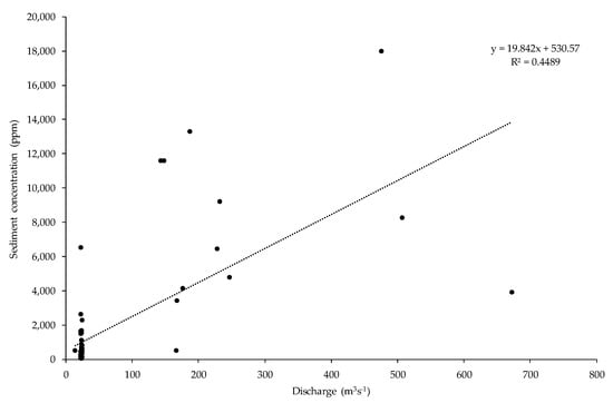 For the hypothetical settling reservoir, a grid of 22 × 6 × 6 (792 cells) was used. Inflow into the basin was taken as 24 m3 s−1; sediment discharge was considered as 10, 156, and 151 kg s−1 for sand silt and clay particle sizes, respectively. The water level of 2 m from the bed of the settling reservoir was considered as an outflow boundary condition. The flows and sediment concentration data of 2016 was used to calculate the amount of sediment deposition in the proposed settling reservoir. For this purpose, a sediment rating curve was developed to calculate the sediment concentration during missing days (Figure 4). The amount of bedload in river flows during rainfall events assumed as 10% of suspended sediment load as suggested by [48]. For improved estimates of the sediment load, the continuous records approach applied by [49] can be used, but it requires the hourly or daily sediment concentration data.