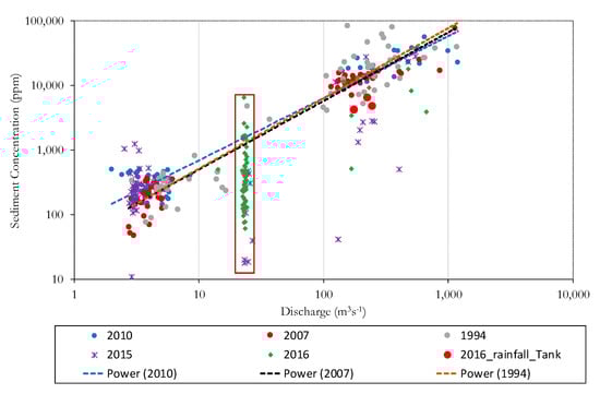 A few high sediment concentrations were also observed at high discharges, i.e., >100 m3s−1, as shown in Figure 6. The figure shows high sediment concentration in 2016 as large red circles which correspond to the days when rainfall was observed at the Tank meteorological station. This confirms that the sub-catchment contributes high sediments in response to rainfall events as the sediment concentration was observed more than 4000 ppm during all rainfall events. However, sediment concentrations ranging from 61 to 6540 ppm in the same year 2016 (shown in green color) are clustered corresponding to 24 m3s−1. This sediment concentration is likely to be coming from water releases from the GZ dam, which is controlled to 24 m3s−1. It suggests that the dam also contributes to high sediment load during the flushing operation. Similar sediment concentration scatter was observed in the Upper Chenab Canal (UCC) and Marala Link Canal (MRLC) in Pakistan by [49], where average sediment concentrations were 450 and 500 ppm, respectively. However, the sediment concentration observed at the Gomal river monitoring station is much higher than UCC and MRLC. The above analysis is based on the suspended sediment concentration data only because the bed load at the monitoring station is not observed.