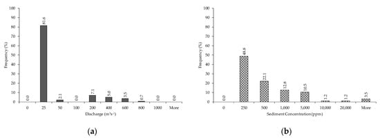 Histogram for data during 2015–2016; (a) discharge; (b) sediment concentration.