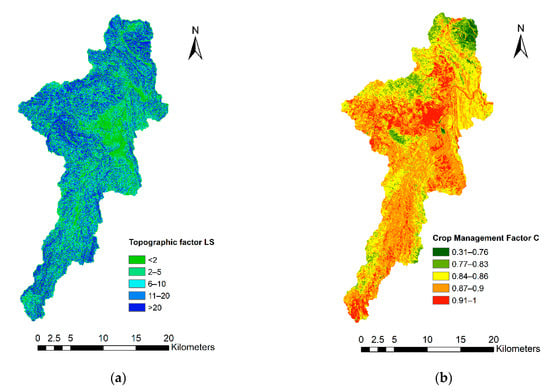 Revised universal soil loss equation (RUSLE) factors estimation in the sub-catchment; (a) topographic factor LS; (b) crop management factor C.