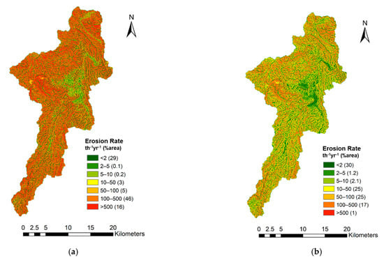 The results (Figure 9a) show that 46% of the sub-catchment area shows a very severe annual erosion rate (100–500 t h−1) while 16% shows a catastrophic annual erosion rate (>500 t ha−1). Very severe and catastrophic erosion rates have also been reported by different researchers for Pakistan, India, Ethiopia, and Brazil [34,55,56,57]. The main reasons for such high erosion rates are steep topography, sparse vegetative cover, and highly erodible soil type. The sub-catchment can be characterized as highly prone to erosion as compared with other catchments in Pakistan, e.g., the Simly dam catchment [58] or the Potohar Plateau [34,59]. Similarly, the soil erosion rates in the sub-catchment are much higher than reported catchments in the other region of the world, for example, in Nepal [60] and Ethiopia [61].