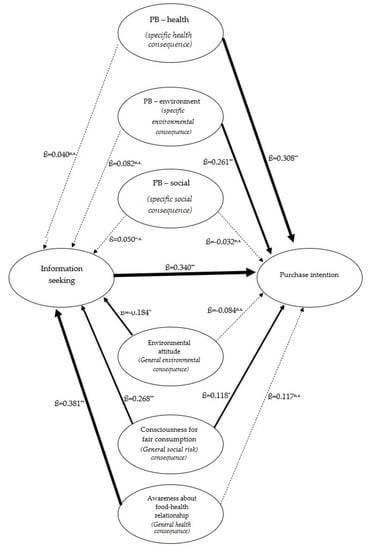 In addition to direct effects, we also examined the indirect effects of the consequence factors in our model perceived both in general and specifically in association with palm oil via information-seeking as mediating variable. We assessed the nature of the mediation effect based on the types demonstrated by Hair et al. [47]. For health consequences perceived in general, indirect-only mediation exists. The results summarized in Table 9 show that the direct effect was not significant, but the indirect effect was (ß = 0.130, p = 0.000). Thus, the perception of the health consequences of food consumption did not directly influence the purchase intent of palm oil-free products but did influence respondents’ information-seeking on palm oil. Through this mediating variable, we already experienced a significant effect (total effect ß = 0.246, p = 0.001). However, for attitudes related to general environmental outcomes, there was no significant effect even in this case, as neither the direct nor the indirect effect (ß = −0.062, p = 0.055) was significant. The effect of non-palm oil-specific social outcomes was intensified by the mediating variable, thus complementary mediation exists. However, the thusly emerging total effect was no longer so important (ß = 0.209, p = 0.000) as in the case of the health risks (ß = 0.246, p = 0.001). In the case of the environmental and health consequence perceived in relation to palm oil, we found direct-only nonmediation, as there was a significant effect only for the direct relationship, and for the social consequences, no significant effect was found at all (no-effect nonmediation). Whereas two of the risks perceived in general did not have a direct significant effect on purchase intent, they do have one through information seeking. Problems specifically associated with palm oil only directly influenced purchase intent for palm oil-free products, and information-seeking did not mediate it for any of the risks.