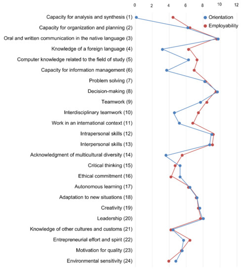 The least valued competencies in the orientation process are knowledge of a foreign language (3.1), acknowledgement of multicultural diversity (3.5) and the ability to manage information (3.6). The soft skills that are the least valued for the level of employability are environmental sensitivity (3.8), knowledge of other cultures and customs (4.1) and ethical commitment (4.1) (see Figure 1).
