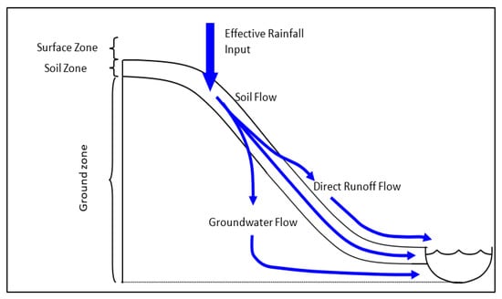 where qsz and qgz are the outflows from the soil and groundwater zones (m3 s−1 km−2), peff is the hydrologically effective rainfall (m3 s−1 km−2), β is the base flow index (Ø) and Tsz and Tgz are the response times associated soil and groundwater zones (days).
