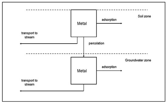 where C11 and C12 are the rates of metal adsorption to the soil sediment and aquifer matrix. It is assumed that there are no diffuse inputs of metals to the catchment. The first term on the right-hand side of Equation (14) represents the lateral movement of metals transported with the flow to the stream. The second term represents the adsorption of a metal to the soil sediment. The first term on the right-hand side of Equation (15) represents the input of a metal from the soil to the groundwater zone by percolation, the second term represents the lateral flow of the metal from the groundwater to the stream and the third term represents the adsorption of metal to the aquifer matrix. The main flow paths for the metals are shown in Figure 5.