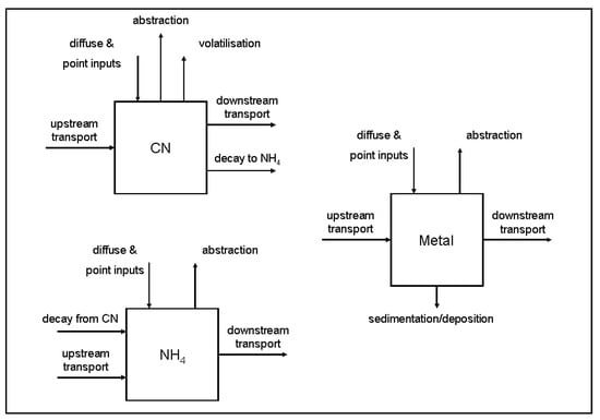 A new novel multi-branch model, INCA-Metals, has been developed to model pollution impacts in rivers and their tributaries, and the model has been applied to assess metal pollution and a range of restoration strategies. The INCA-Metals model builds on the existing suite of INCA models that have been developed over the past 20 years to simulate both terrestrial and aquatic systems [,,,]. The structure of INCA has been tested on many catchments, including 20 UK catchments, 25 catchments across Europe, and globally on large river systems such as the Mekong, the Ganges and the Volta [,,]. Early major applications of INCA have been published in two special volumes of international journals [,]. The advantage of INCA is that the model seeks to incorporate the dominant mechanisms and processes operating so that a realistic and rapid assessment of environmental change can be evaluated. In this paper, a new version of the model, INCA-Metals, is described for rivers and catchments to simulate eight metals (cadmium, lead, zinc, mercury, arsenic, copper, chromium, manganese), as well as cyanide and ammonia. Cyanide and ammonia are included so that the metals model can be applied to mining waste issues. Cyanide is a key component of gold metal extraction processes, and ammonia is often released from the mining effluent treatment process. Both can be extremely toxic to river systems and hence have been included in the model.