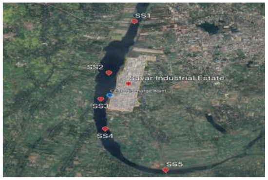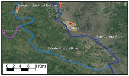 The pollution in Hazaribag has been of national concern since the 1980s, when the government first instructed tanneries to control their pollution footprint [,]. In 2001, The High Court of Bangladesh ordered the tanneries to apply the necessary measures to limit their toxic discharges within one year, following the submission of a written petition by the Bangladesh Environmental Lawyers Association (BELA). In 2002, the government approved a relocation plan to move the tanneries to Savar district (adjacent to the Dhaleshwari river), and in 2003 the Bangladesh Government signed an industry transfer agreement with the Small and Cottage Industries Corporation (BSCIC) and major leather tannery industry associations. Due to a series of political and economic issues, the relocation only formally took place in 2017. While currently over 90% of the tanneries have now moved to Savar, the new effluent treatment plant is still incomplete and not operating fully and efficiently. The introduction of tannery discharges in Savar has created additional pollution in the Dhaleshwari River system. Studies have revealed a gradual deterioration of its water quality over the past two decades [,,,], with several urban and industrial discharges along the river. Heavy metals have risen in water, sediments, and with alarming levels recorded in fish, which have been designated “unfit for human consumption” [].