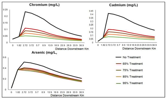 In order to determine the percentage level of upgrade needed in the CETP and highlight the impact of its improved performance on the water quality of the Dhaleshwari, different improved CETP treatment scenarios were simulated using INCA-Metals. This is the first modelling study to have targeted the impact of the relocated tanneries’ discharges at Savar on heavy metals in the Dhaleshwari River. This has involved setting up the process-based dynamic flow and quality model INCA Metals for the Dhaleshwari River catchment so that we could simulate a series of river reaches from its source down to the Buriganga. As shown in Figure 8, we model reaches of the river that correspond to the sampling locations and then add additional reaches down to the confluence point with the Buriganga River (Figure 7). Knowing the flow data for the river and the effluent discharge flow rate, then, by mass balance, we can estimate the effluent discharge concentrations. Using these concentrations, we can then evaluate the model performance, and the model simulates the concentrations of a range of metals with some accuracy, as shown in Figure 9. We can then use the model to simulate the impact of the discharge on the river system under a range of seasonal conditions and also a range of mitigation scenarios. Figure 10 shows a set of simulations along the river under low flow (i.e., dry season/worse case) conditions together with a set of treatment scenarios for the three heavy metals identified to have strongly impacted the Dhaleshwari during the sampling period. The concentrations along the river were simulated under the estimated low flow conditions to further highlight the gravity of the situation. It can be seen that levels of Cr, Cd and As are very high (black line) and well above international environmental standards if no treatment improvement is made (Table 7). These three key metals are of particular interest because of their impact on human health and fisheries. The results suggest that the CETP at Savar needs to operate at much higher levels of efficiency to control the river pollution, depicted by the other lines on the graphs representing improvements to the treatment plant under a range of scenarios from 65% to 95% reductions in discharge concentrations. In order to meet reasonable environmental conditions, an improvement of approximately 85% is required. Of course, a big issue with water quality modelling is that of uncertainty as decay parameters have not been measured explicitly but assumed from other studies [,]. Thus, the modelling results are subject to uncertainty and may vary along the river system under different assumptions. Another limitation is the lack of information regarding other discharges along the river, which were consequently not incorporated into the model used. Thus, the treatment improvement percentages suggested in our study are non-conservative and may vary, depending on many assumptions, but are nevertheless important in order to highlight the level of pollution control needed to safeguard the water quality of the Dhaleshwari.
