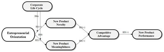 The birth stage, sometimes referred to as the “entrepreneurial stage,” is characterized by a great deal of complexity and a period that demands serious risk-taking [67]. The period of growth, also called the “rapid stage of growth,” is the phase of the business’s expected rapid growth. These two phases are more volatile in this theory than in the other three steps. The authors listed these two phases in this study as the “earlier stages” and the remainder as the “later stages.” According to [86], while EO can initially be useful in highly volatile environments, EO’s impact is more rapidly reduced when the volatility level is high than when it is low. Therefore, we argue that if an enterprise adopts an EO in response to a variety of environmental conditions, depending on the stage of the business’s life cycle, it will have different effects on new product creativity (i.e., new product novelty and new product meaningfulness). EO’s impact on NP creativity may be lower than in the later stages, to explain in more detail since the earlier stages are highly volatile. We, therefore, advance the following hypothesis:
