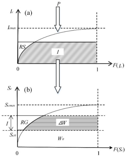 Structure of the vertically mixed runoff (VMR) model. The diagram of (a) the infiltration capacity distribution curve and the generation of surface runoff (RS); (b) the soil moisture capacity distribution curve and the generation of groundwater runoff (RG). P is the net rainfall (or effective rainfall), I is the infiltration, Ic is the infiltration capacity, Icmax is the maximum infiltration capacity within the catchment, Sc is the soil moisture capacity, Scmax is the maximum soil moisture capacity within the catchment, W0 is the initial soil moisture content, ΔW is the changes in the soil moisture content, and Sc0 is the soil moisture capacity corresponding to W0.