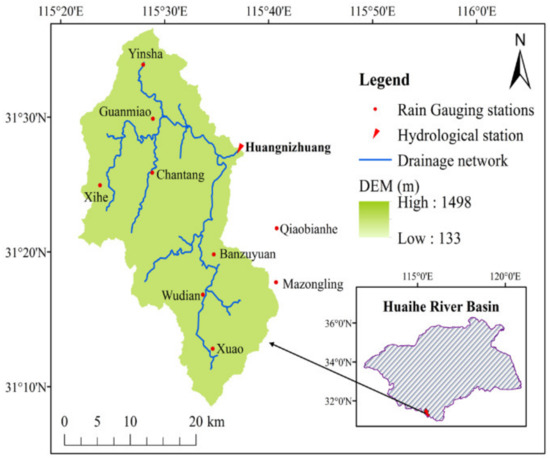 The methodologies described above are applied to the Huangnizhuang catchment located in the Huaihe River Basin in China (see Figure 2). The study catchment approximately covers an area of 805 km2. The mean annual temperature is 11°–16° and the mean annual precipitation is 1077 mm. However, storms usually occur between June and September (summer in China) and account for 50–80% of the total annual rainfall amount [73,74]. Most floods in this region are caused by rainstorms with characteristics of high intensity, short duration, small rainstorm center range, and high peak discharge.