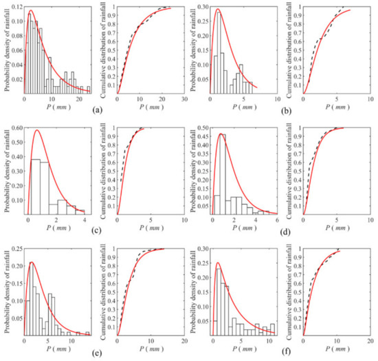 Comparisons of the fitness of the distributions of observed rainfall and the EDD for the rainfall event that occurred on 02/09/2005. The left panels in the subplots represent the probability density function (pdf) of observed rainfall (black bars) and EDD (red lines); the right panels of each subplot represent the cumulative distribution function (CDF) of observations (black dotted lines) and the EDD (red lines). The subplots represent the cases of hourly rainfall that occurred from 11:00 (Figure 3a) to 16:00 (Figure 3f) on 02/09/2005.