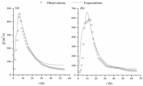 As can be seen from Table 3, all the NSE values of both calibration and validation periods are larger than 0.70, ranging from 0.71 to 0.92, with a mean of 0.82, which indicates good performance of the SRR model. For the calibration period, the average absolute value of the flood peak relative error is approximately 10.9%, ranging from 0.2% to 22.4%; the average absolute value of the flood volume relative error is approximately 11.9%, ranging from 1.6% to 31.5%. For the validation period, the average absolute value of the flood peak relative error is approximately 12.4%, ranging from 9.2% to 14.5%; the average absolute value of the flood volume relative error is approximately 11.5%, ranging from 4.8% to 20.3%. Figure 4 presents examples of the fitness of the observed flow and simulated mean flow chosen from the calibration period (10/05/1989) and validation period (10/07/2005), respectively. Overall, these results indicate that the SRR model has the potential for flood simulation as far as the expected values are concerned. Further study will delve into the probability forecast of the SRR framework when its variance is considered.